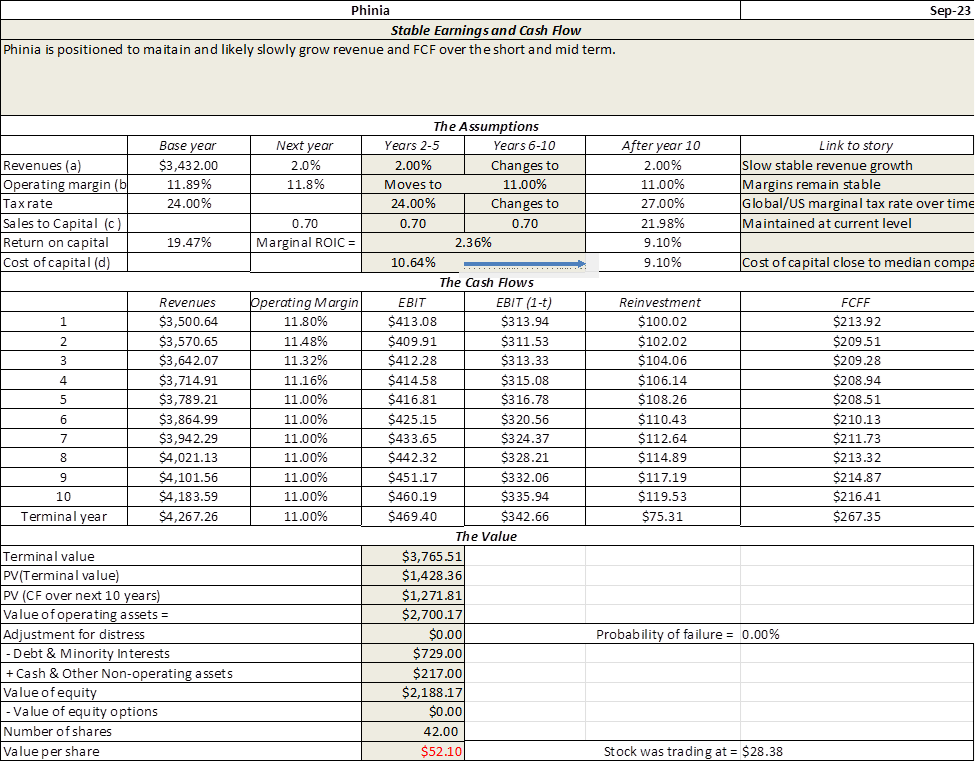 For the value model I used a FCFF model with credit due to Professor A. Damodaran for providing free access to and creating the template. His website https://pages.stern.nyu.edu/~adamodar/New_Home_Page/spreadsh.htm has all sorts of useful spreadsheets that can help valuation.